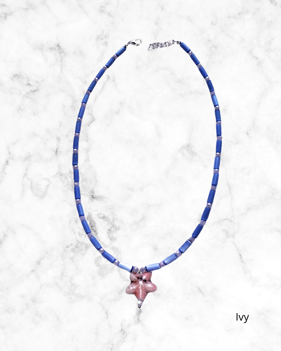 Collana a girocollo con Perline Occhi di Gatto Cilindro Blu chiaro e perline di cristallo....