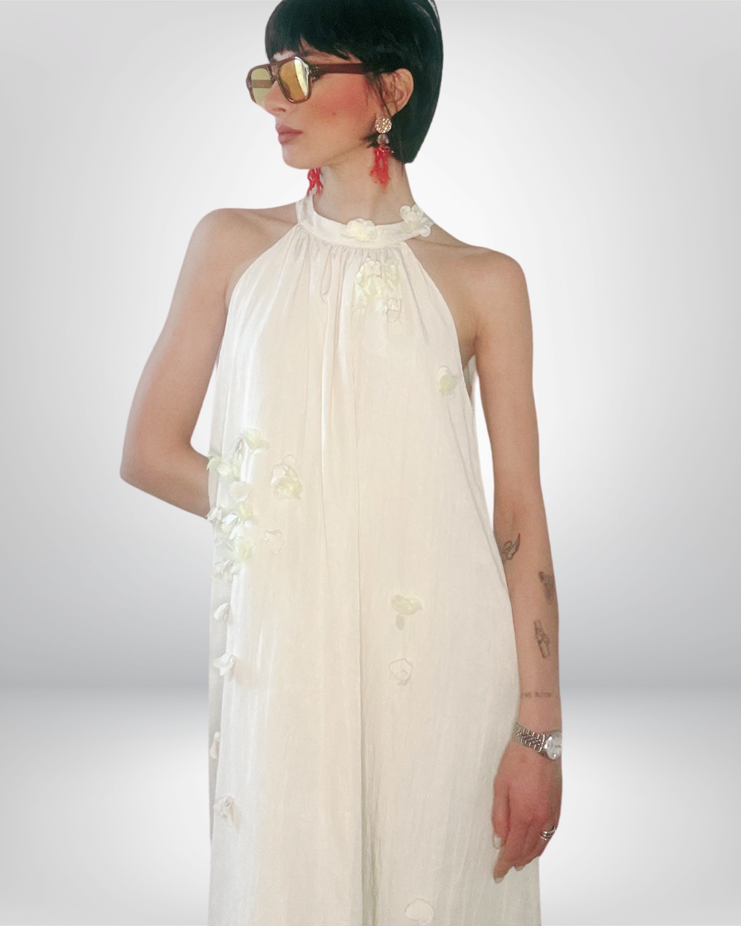 Abito LUMINA lungo con scollo halter. Presenta apertura sul retro. Vestibilità morbida.