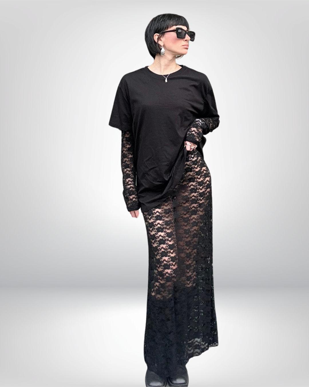 Un vestito in pizzo elegante, che scende dolcemente, con un design delicato e dettagli intricati...
