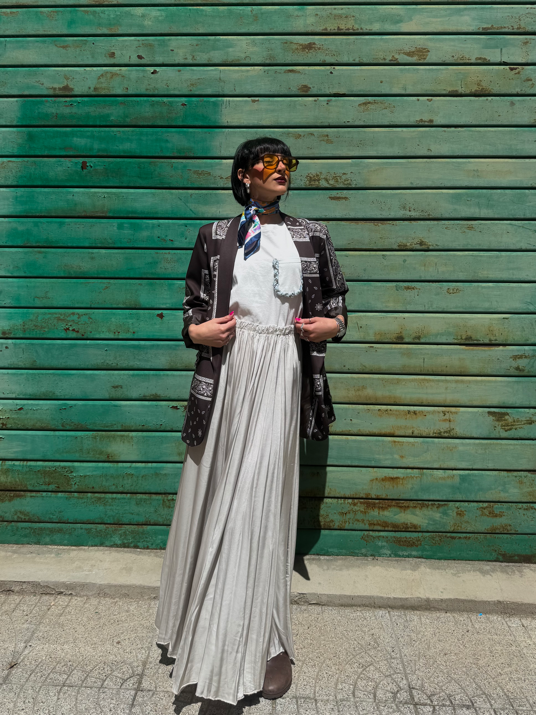 Una gonna lunga in satin, caratterizzata da una lucentezza elegante e raffinata che cattura la...