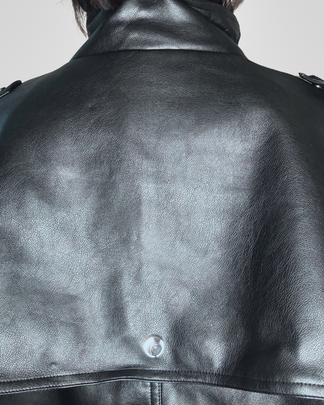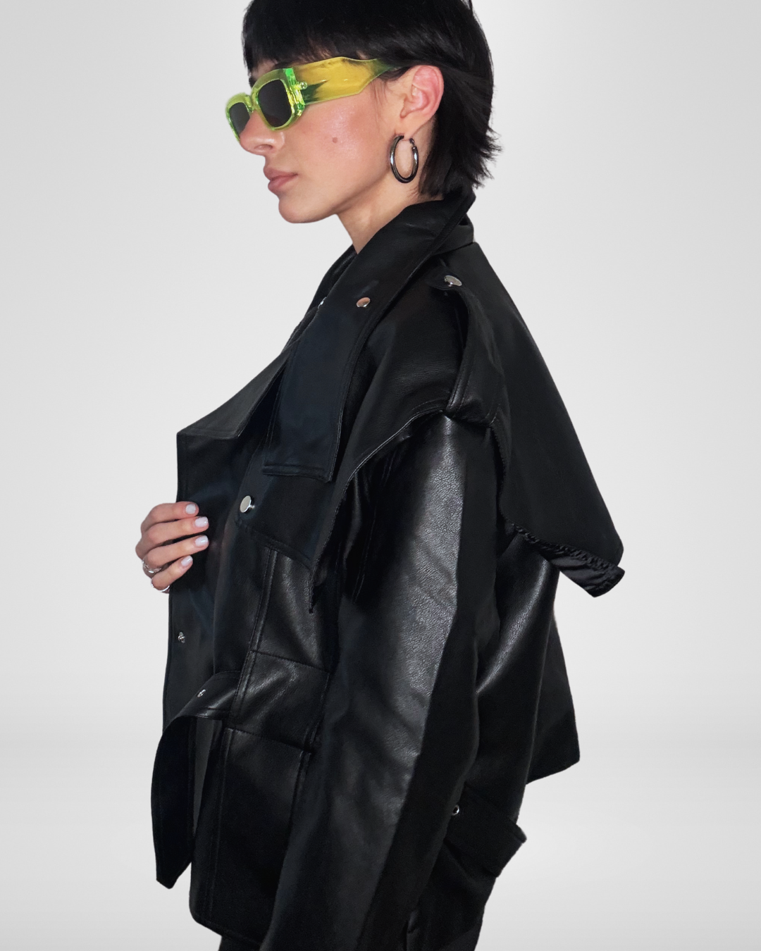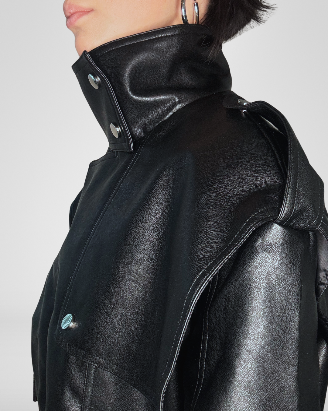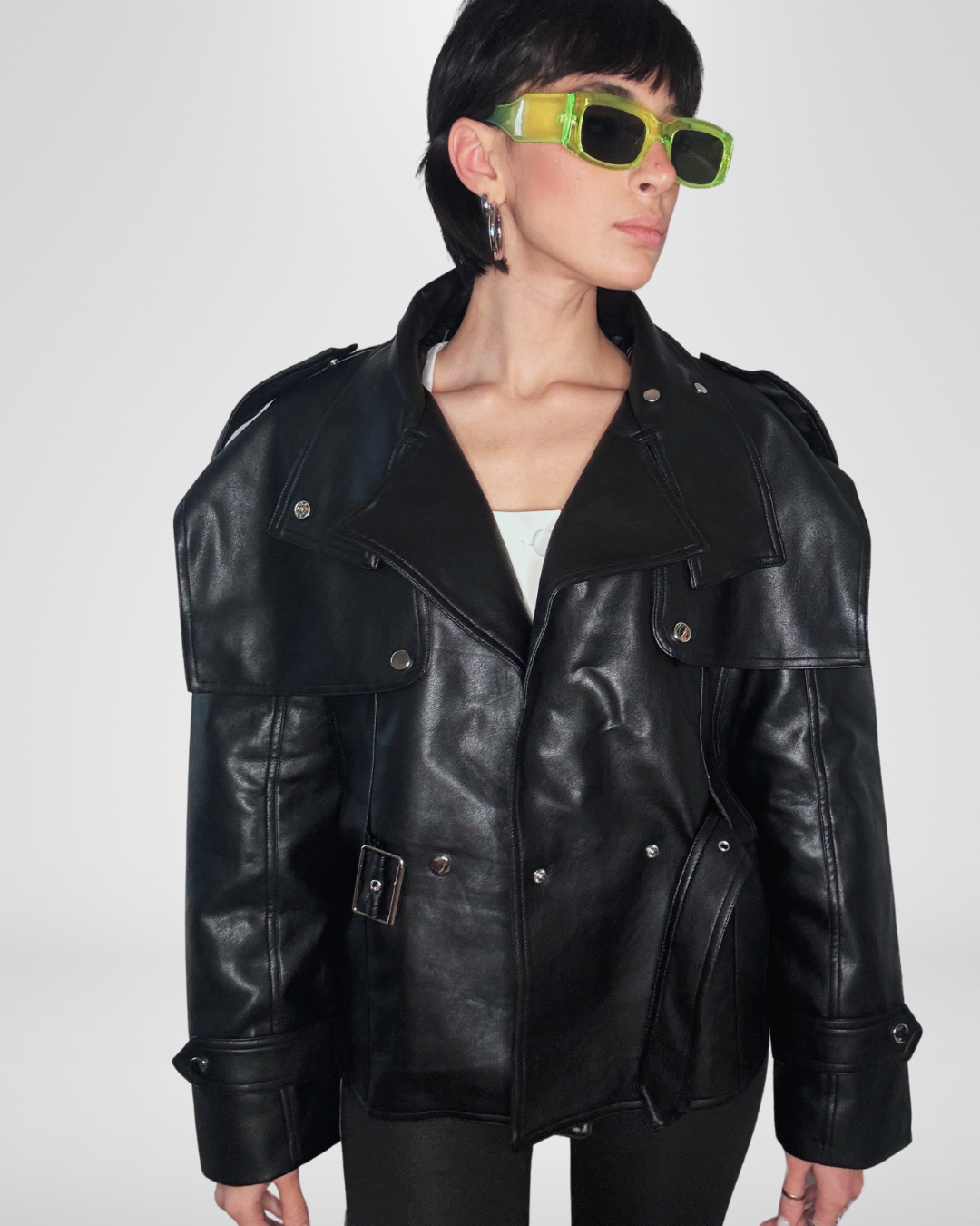 La giacca di pelle super strutturata presenta un design audace e distintivo, perfetta per chi desidera un look unico e contemporaneo. Realizzata in pelle di alta qualità, la giacca è caratterizzata da linee decise e una silhouette robusta che conferisce carattere e presenza.