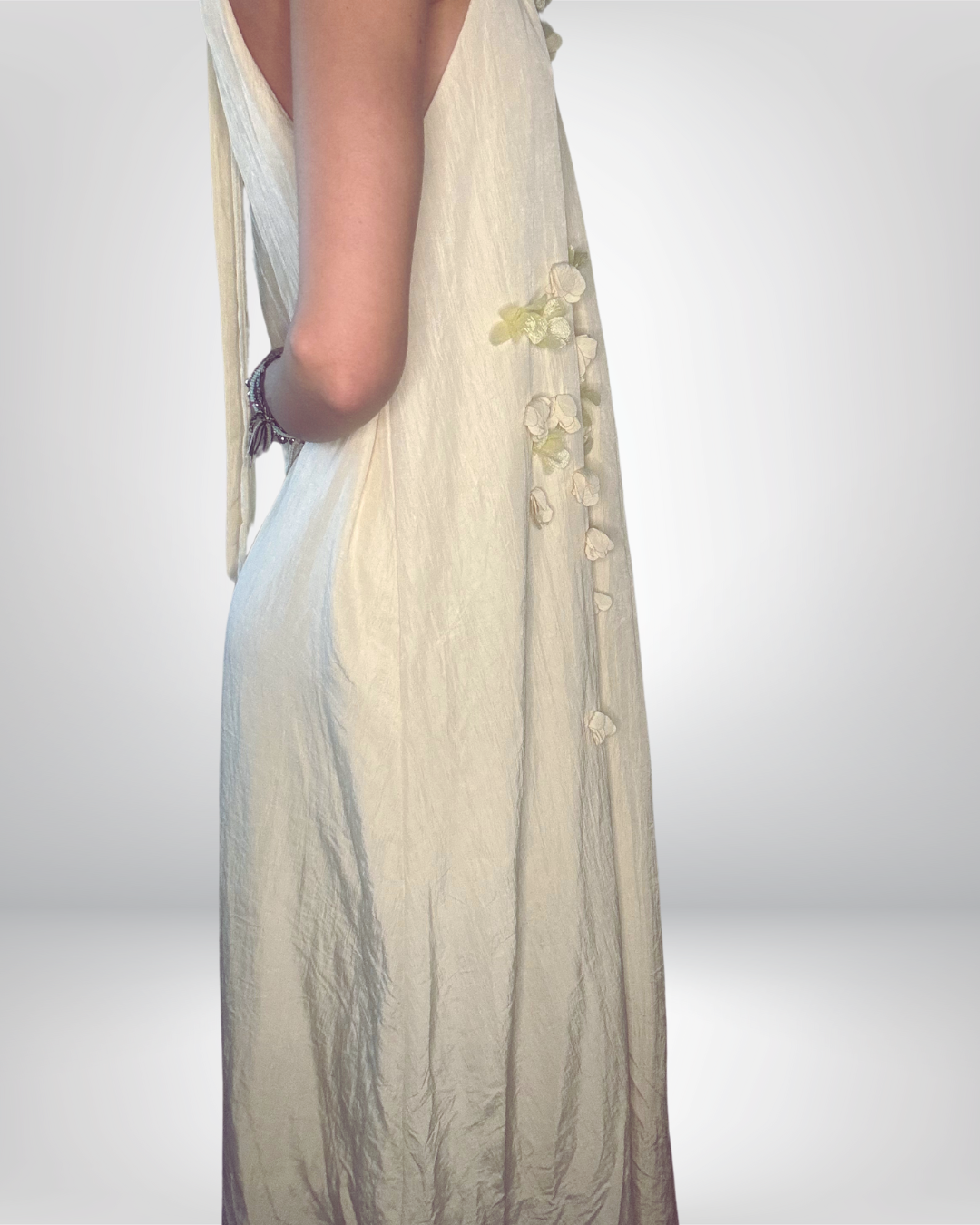 I dettagli floreali tono su tono, posizionati strategicamente sui lati, aggiungono un tocco di delicatezza e romanticismo. Questi fiori, realizzati con cura e attenzione ai particolari, si integrano armoniosamente con il tessuto, creando un effetto visivo che è al contempo sofisticato e discreto. La scelta di tonalità simili per il vestito e i dettagli floreali permette di mantenere un’armonia cromatica, esaltando la bellezza del design senza risultare eccessivo.
